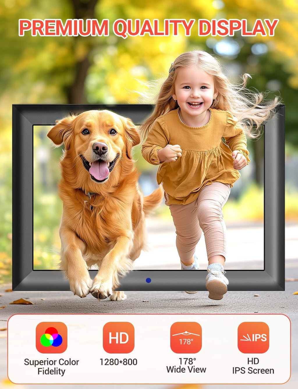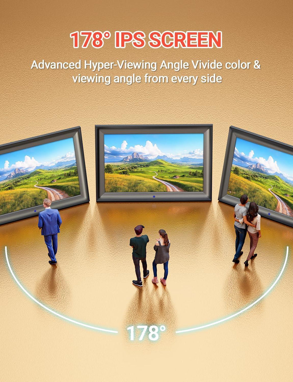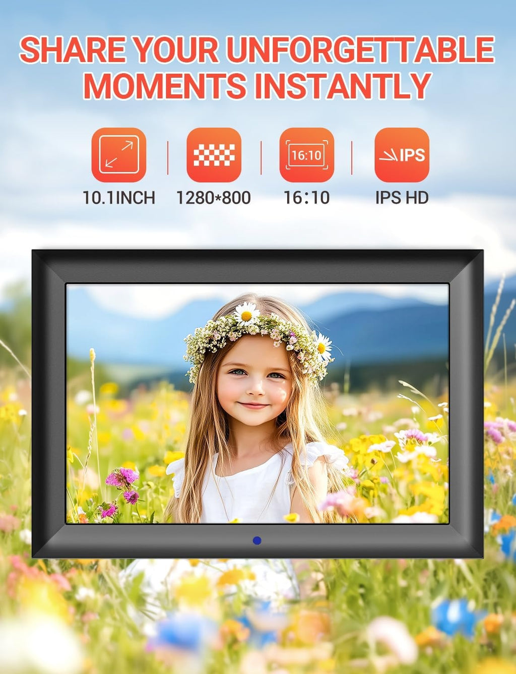 10.1 inch IPS display: this digital picture frame has a 10.1 inch IPS screen with a resolution of 1280 x 800 and a viewing angle of 178°. Vibrant colours and razor-sharp details bring your precious memories to life. The 16:10 aspect ratio provides a natural and immersive viewing experience.