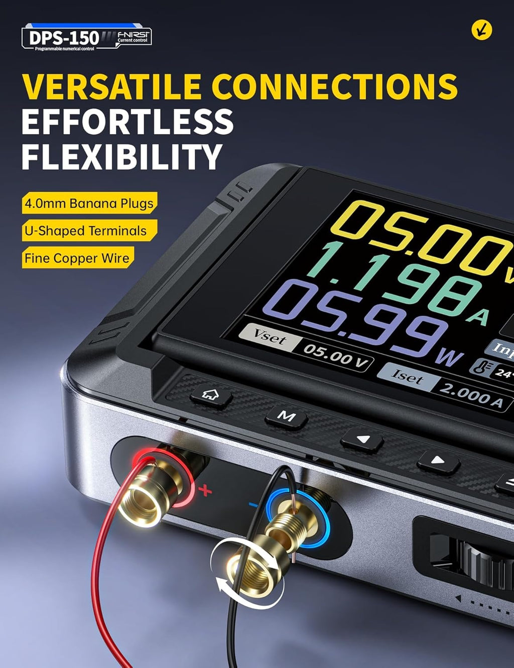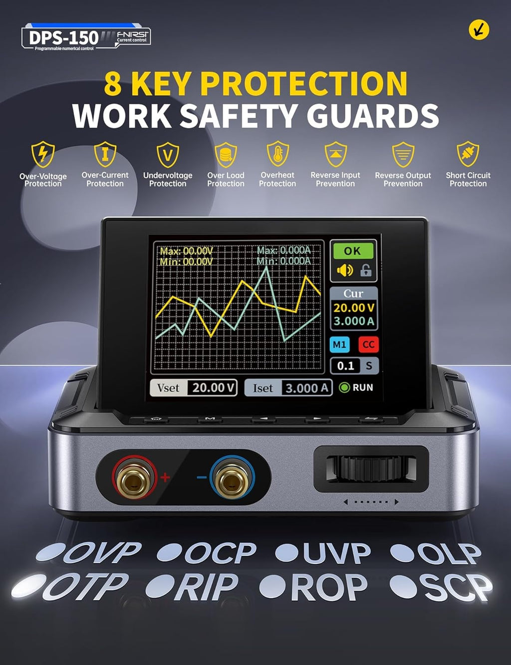 The FNIRSI-DP150 is a high-performance adjustable DC power supply launched by our company. It features a Type-C input interface and multiple power supply modes, allowing precise adjustment of output voltage (0-30V) and current (0-5A). It provides efficient, low-consumption, and stable output, equipped with multiple safety protection functions including overvoltage, overcurrent, overload, overheating, and reverse connection. It can be flexibly applied to serial connection of multiple devices, with rich and user-friendly display and operation, compact and portable humanized design, meeting various application needs. It is designed to provide you with high-performance and stable CNC power supply.