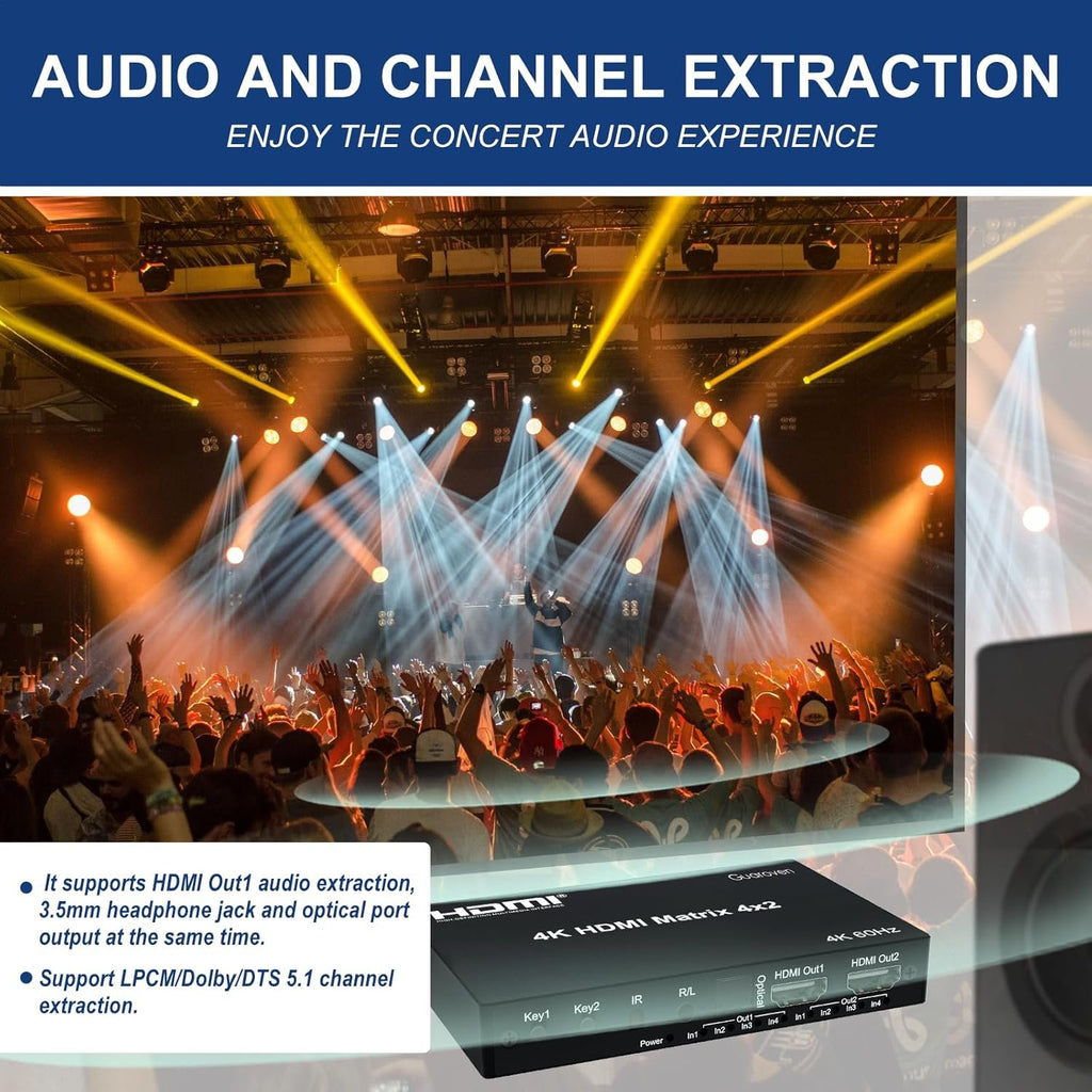 Audio Extract: Supports LPCM/Dolby/DTS 5.1 channel and smart EDID management. Any input HD source can do audio extract separately or simultaneously by Optical SPDIF or 3.5mm headphone audio output port