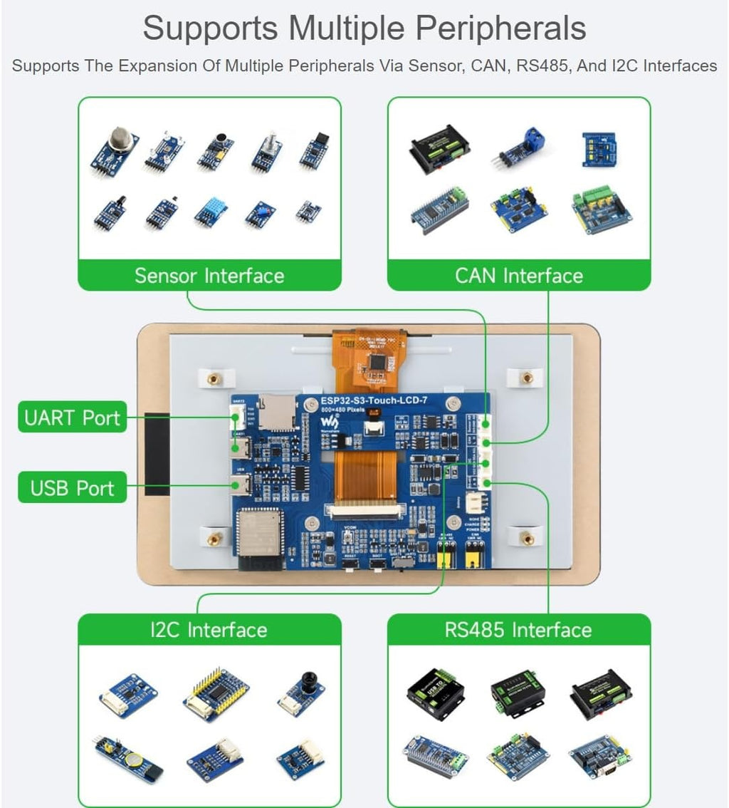 Waveshare 7 inch ESP32-S3 Capacitive Touch Display Development Board 800 x 480 65k RGB 7 Inch LCD Screen, 5-Point Touch, Supports WiFi and Bluetooth